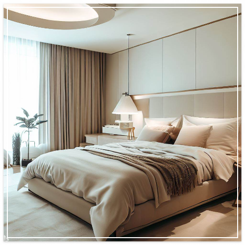 -. 침실은 정적인 공간이므로 밝고 화사한 색상보다는 은은하고 차분한 색상을 사용한다. 특히, 화이트나 아이보리, 베이지, 연한 갈색 등의 컬러는 청결함과 복을 상징한다.