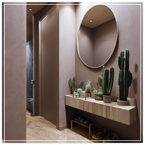 -. 현관문과 중문 사이에는 공간을 두어야 한다. 이 공간은 좋거나 나쁜 기운들이 순환하는 곳으로 화분 같은 식물을 놓아두면 좋다. 식물을 두면 공기가 깨끗해지고 심신이 안정되는 효과가 있는데, 식물을 선택할 때는 살아있는 식물로 선택해야 한다. 드라이플라워는 피해야 한다. 식물의 색상도 중요한데, 녹색은 생기와 활력을, 붉은색은 활력과 열정을, 흰색은 순수와 깨끗함을 주고, 파란색은 평화와 차분함을 준다. 현관에는 주로 싱그러운 기운을 주는 식물을 두는 것이 좋다. 선인장은 나쁜 기운이 못 들어오게 막아준다고 하니 다른 소품들과 같이 잘 배치해 놓으면 좋다.