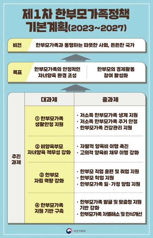 2023년 4월 10일 사회부총리 주재 사회관계장관회의에서 '제1차 한부모 가족 정책 기본계획'을 심의, 의결했다고 밝혔다. 이번에 발표된 내용은 한부모 가족 관련 5년 단위 기본 계획 수립 근거를 담은 한부모 가족 지원법 시행(2021년 4월 21일)에 따라 정부의 국정운영 방향에 맞는 지원 확대를 위해 마련되었다.