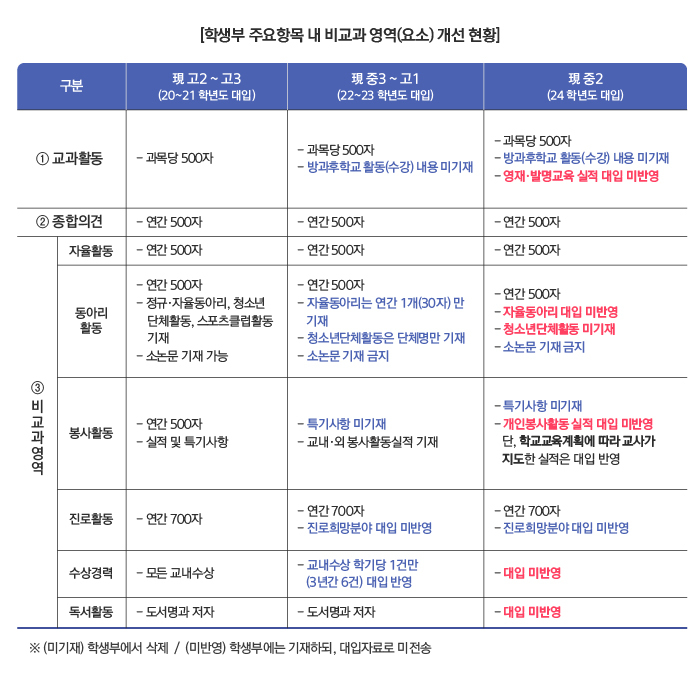 교과 세부능력 및 특기사항(교과 활동): 과목당 500자는 변동이 없으며 방과후학교 활동(수강) 내용 미기재, 영재 발명교육 실적 대입 미반영으로 변경되었다(2024년도 대입, 2023년 고3 학생 적용). 기타 활동에 대한 내용들이 미기재 또는 미반영이면서 과목당 글자수의 변동이 없다는 것은 양보다 질을 우선시 한다고 보면 된다. 세특 관련 내용은 학종에서 참고.