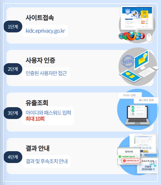 -. 유출이력이 존재하는 경우에는 즉시 패스워드를 변경하여 '명의도용, 사기거래, 보이스피싱 등'의 2차 유출피해를 방지할 수 있습니다.